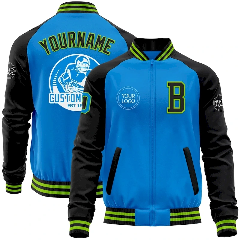 £16.99Custom Powder Blue Neon Green-Black Bomber Varsity Letterman Two Tone Zipper Jacket